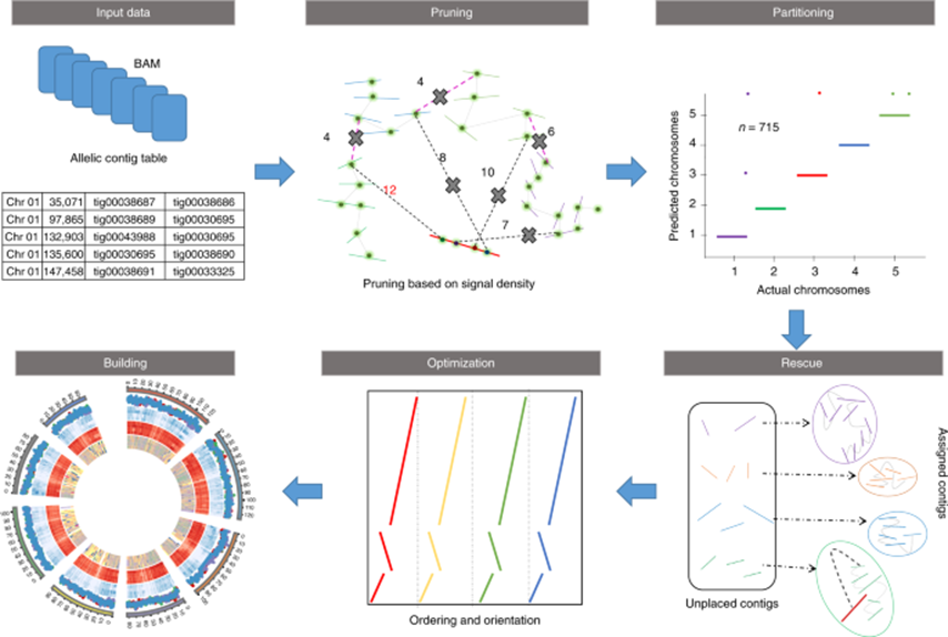 2019年8月5日,福建农林大学基因组中心张兴坦副教授和唐海宝教授研究组在Nature Plants杂志在线发表题为“Assembly of allele-aware, chromosomal-scale autopolyploid genomes based on Hi-C data”的研究论文,开发了一种 ALLHiC 算法,成功完成了同源四倍体和同源八倍体甘蔗染色体水平组装。ALLHiC 可以从头组装获得单倍型染色体水平的多倍体基因组,分离每一个等位基因。ALLHiC 同时适用于多倍体和杂合二倍体的单倍型染色体水平组装。